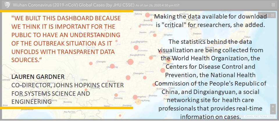 The dashboard, built by a team at the Johns Hopkins Center for Systems Science and Engineering and regularly updated with data from the WHO, CDC, and other sources, illustrates how the virus is spreading in China and beyond
