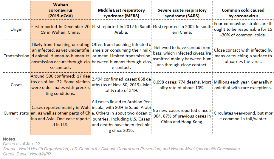 | Wuhan coronavirus (2019-nCoV) | Middle East respiratory syndrome (MERS) | Severe acute respiratory syndrome (SARS) | Common cold caused by coronavirus | |