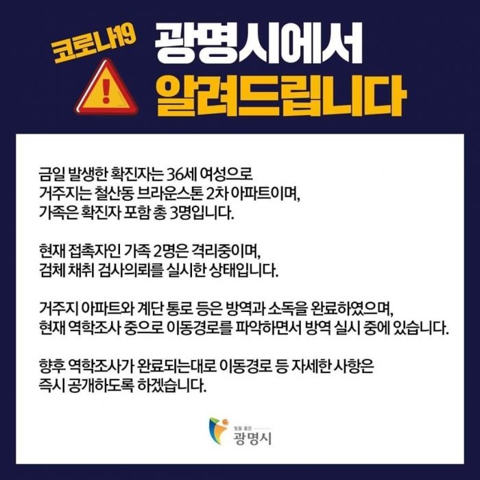 공개된 정보에 따르면 확진자는 36세 여성으로 광명시 철산동 브라운스톤2차아파트에 거주하고 있다. 가족은 확진자 포함 총 3명이다.