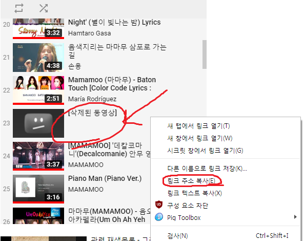삭제된 동영상 우클릭해서 링크주소 복사를 누름