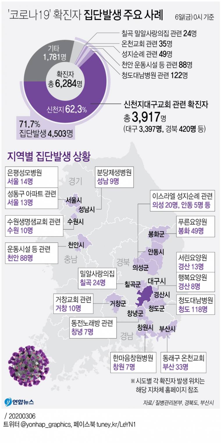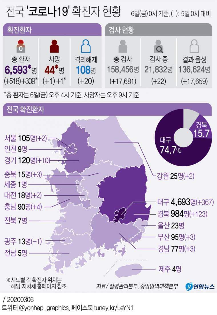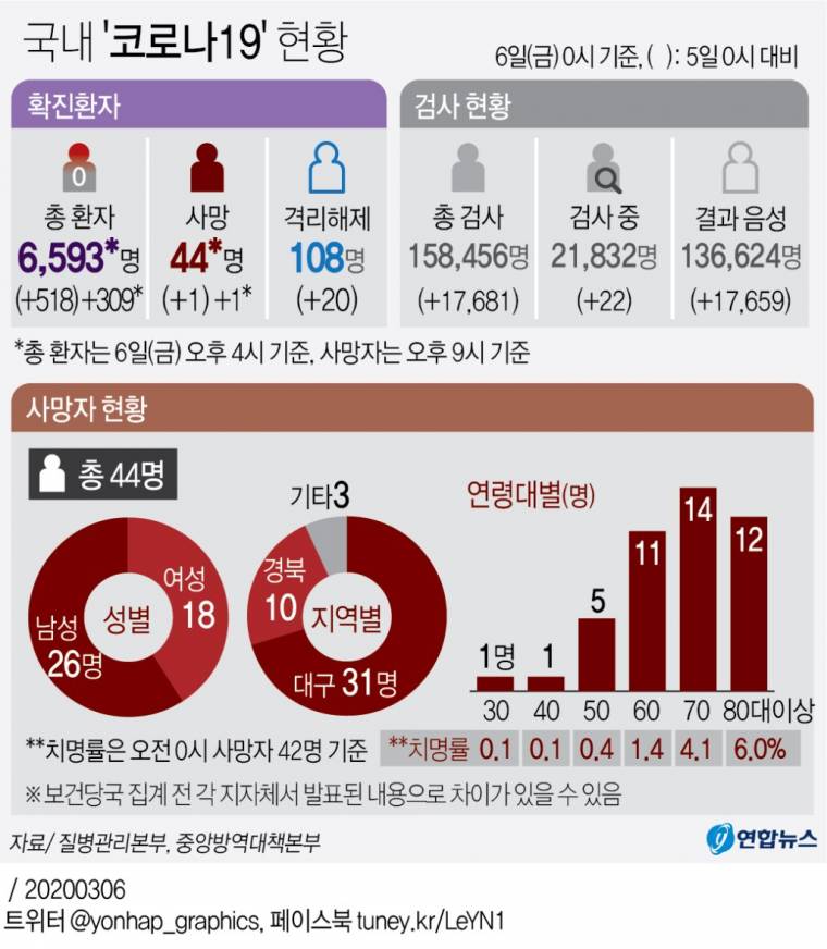 한국 내 - 확진자: 6,284명 (전일 대비 +518명) /