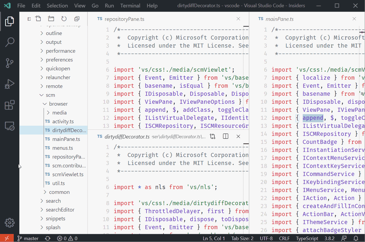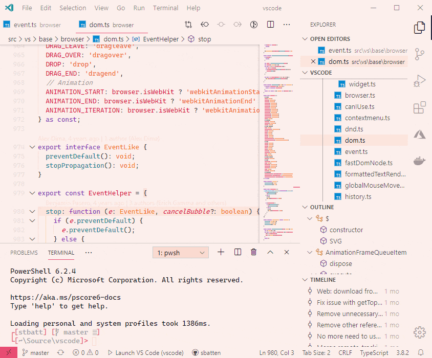 VS Code now bundles TypeScript 3.8.3. This major update brings support for new language features including ECMAScript private fields, top-level await expressions, and the export * as ns syntax, along with many tooling features and improvements. The update also fixes a number of important bugs.