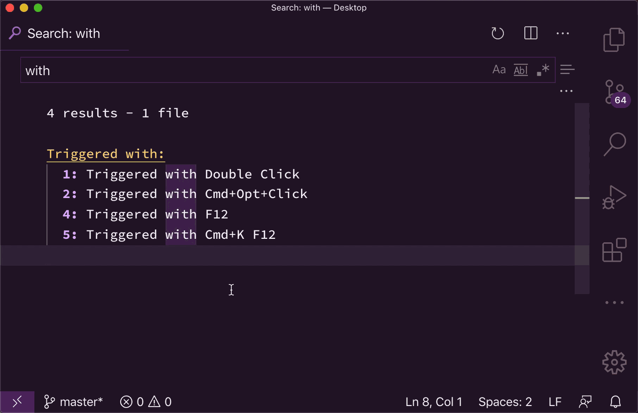 In a Search Editor, results can be navigated to using Go to Definition actions, such as F12 to open the source location in the current editor group, or Ctrl+K F12 to open the location in an editor to the side. Additionally, double-clicking can optionally open the source location, configurable with the search.searchEditor.doubleClickBehaviour setting.