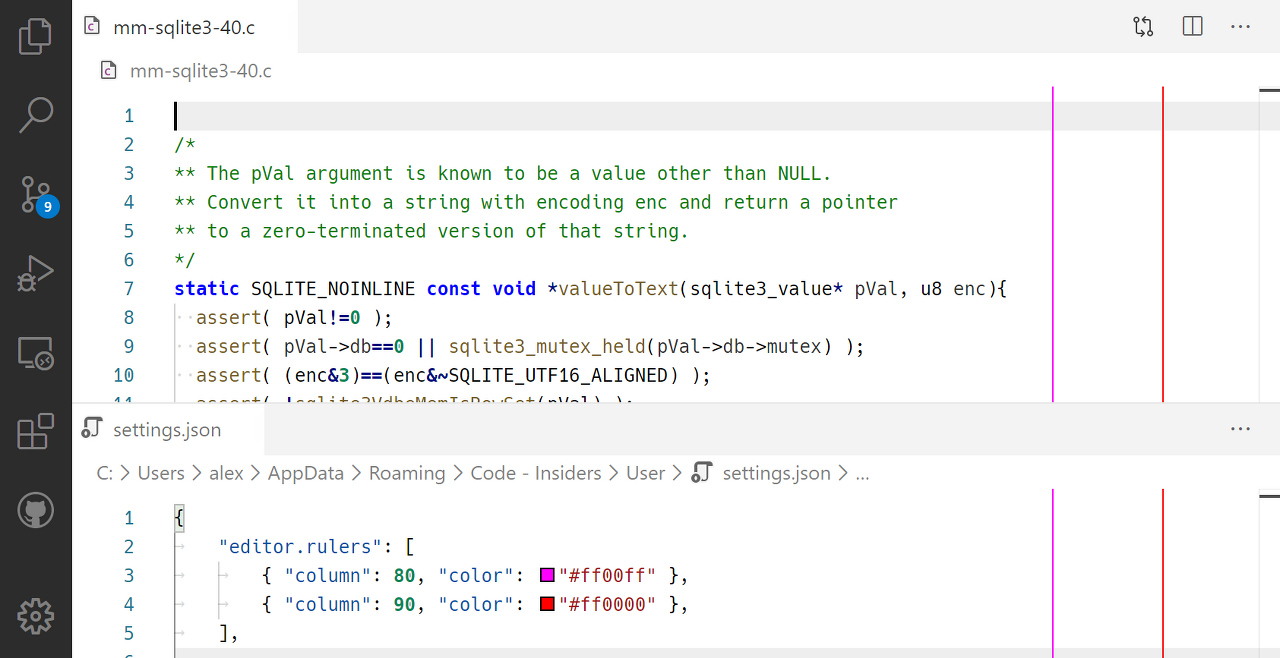 The existing editor.rulers setting has been extended to allow defining rulers that have custom colors. In the following screenshot, there is a magenta ruler at column 80 and a red one at column 90: