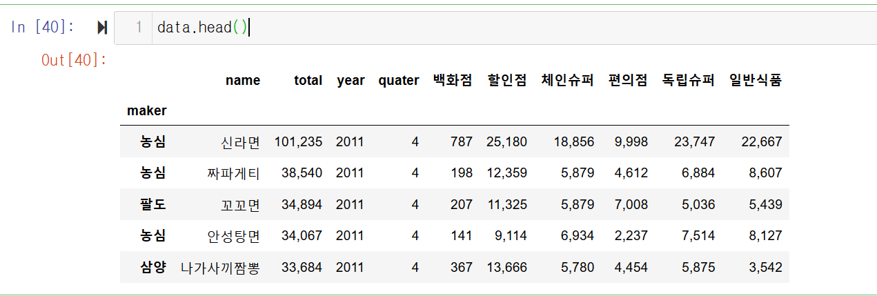 data.columns = ['year', 'quater','maker', 'name', 'total','백화점','할인점','체인슈퍼','편의점','독립슈퍼','일반식품']