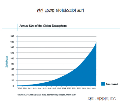 전 세계적으로 생성되는 데이터의 총량이 해가 갈수록 급 격하게 늘어나고 있다. HDD 제조기업 씨게이트테크놀로지 (Seagate Technology)가 시장조사기관 IDC에 의뢰해 발간 한‘데이터에이지2025(Data Age 2025)’백서에 따르면, 2025년까지 전 세계 데이터 총량은 약 163제타바이트(ZB)까 지 늘어날 전망이다.