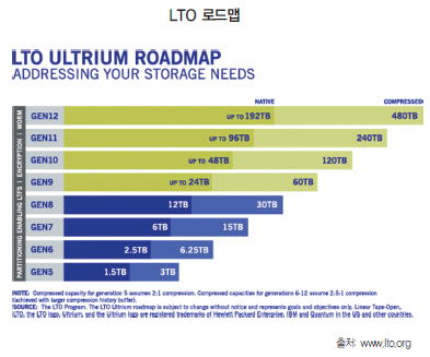 지난 2000년 HP, IBM, 퀀텀 등의 기업들이 모여 처음 정립 한 LTO-1 기술은 당시 기본 100GB의 용량을 지원했으며, 이 후 꾸준한 발전을 거듭해 올해 12월 LTO-8 기반 제품이 본격 출시를 앞두고 있다. LTO-8 테이프 드라이브는 기본 12TB, 압축 기준 32TB의 용량과 무압축 기준 427MB/s의 전송속도 를 지원한다. LTO 기술은 현재 LTO-10까지의 로드맵이 공식 적으로 발표됐다. 차세대인 LTO-9은 비압축 기준 26TB의 용 량 및 최대속도 708MB/s, LTO-10은 48TB 용량 및 1100MB/s의 성능을 제공할 것으로 예상되고 있다. 다만 대체 로 2~3년 주기로 차세대 표준의 제품이 등장하고는 있지만, LTO-8이 막 출시된 만큼 LTO-9 이후 제품의 출시 시기는 아 직 확실히 결정된 바가 없다.