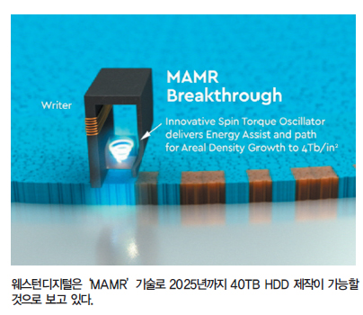 웨스턴디지털의 설명에 따르면 MAMR 기술의 핵심은‘스핀 토크 발진기(Spin torque oscillator)’에 있는데, 이는 초고밀 도 환경에서도 신뢰성 손실 없이 데이터 기록 능력을 향상시켜 주는 마이크로파 필드(Microwave field)를 생성하는 데 사용 된다. 이를 바탕으로 웨스턴디지털은 MAMR 기술을 이용, 제 곱인치 당 4테라비트(Tb, 4Tb는 500GB) 이상의 기록밀도를 제공할 것으로 기대하고 있으며, 지속적으로 기록밀도를 향상 시켜 2025년까지 40TB 이상의 용량을 갖춘 HDD 개발이 가 능할 것으로 전망하고 있다.