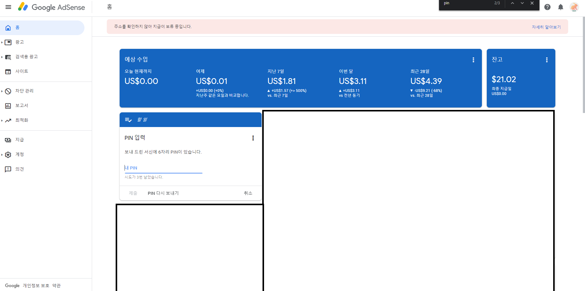 구글 애드센스에서 알림에 떳다. 핀번호를 입력하라고..