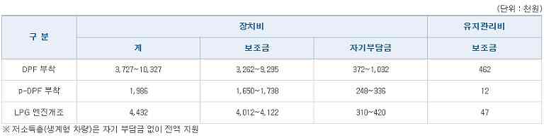 대기환경보전법 제 58조(저공해자동차의 운행 등)에 의거 오염물질을 다량 배출하는 노후 경유차와 노후 건설기계를 대상으로 조기 폐차, 매연저감장치 부착 등에 소요되는 비용을 지원하는 사업