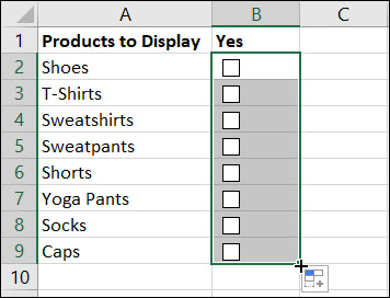 자동 완성을 사용하려면 체크 박스가있는 셀의 오른쪽 하단 모서리에 커서를 놓습니다. 채우기 핸들 (더하기 기호)이 표시되면 드래그하여 추가 셀을 채우고 놓습니다.